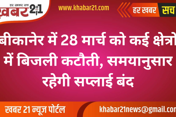 बीकानेर में विद्युत तंत्र के रख-रखाव के चलते 28 मार्च (शनिवार) को विभिन्न इलाकों में निर्धारित समय के अनुसार बिजली आपूर्ति बाधित रहेगी। जानकारी के अनुसार, सुबह 8:30 बजे से दोपहर 12 बजे तक लक्की मॉडल और रानी बाजार क्षेत्र में बिजली बंद रहेगी। वहीं सुबह 6:30 बजे से दोपहर 12 बजे तक आसानियों का चौक और जेल वेल टंकी…
