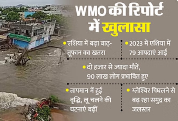 विश्व मौसम विज्ञान संगठन ने एशिया की जलवायु-2023 नाम से एक रिपोर्ट जारी की है। इस रिपोर्ट में बताया गया है कि उत्तर पश्चिमी प्रशांत महासागर के पानी का तापमान रिकॉर्ड स्तर पर बढ़ रहा है, यहां तक कि आर्कटिक क्षेत्र में भी समुद्री गर्म हवाएं चल रही हैं। विश्व मौसम विज्ञान संगठन के महासचिव केलेस्टे साउलो ने बताया कि एशिया के कई देशों में साल 2023 रिकॉर्ड स्तर पर गर्म रहा। इसके साथ बाढ़, सूखा, तूफान और गर्म हवाओं का असर देखने को मिला। जलवायु परिवर्तन से एशिया में आपदा आने की रफ्तार कई गुना बढ़ गई है। जिसका असर हमारे समाज पर आर्थिक नुकसान, मानव जीवन के नुकसान और पर्यावरण पर पड़ रहा है।