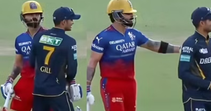 मैच के दौरान उन्हें शुभमन गिल को कंधे से धक्का मारते देखा गया। इसका वीडियो सोशल मीडिया पर अब वायरल हो रहा है। दरअसल, यह सब मजाकिया अंदाज में हुआ। जहां आरसीबी की पारी के दौरान स्टार बल्लेबाज को गिल के साथ मस्ती करते देखा गया। कोहली इस दौरान बल्लेबाजी कर रहे थे जबकि गिल फील्डिंग करते नजर आ रहे थे।