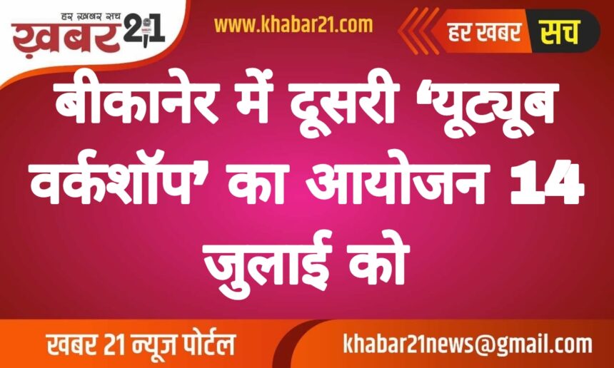 बीकानेर में 14 जुलाई (रविवार) को ‘स्किल डेवलेपमेंट मूवमेंट’ के अंतर्गत दूसरी ‘यूट्यूब वर्कशॉप’ का आयोजन होने जा रहा है। जिसमें यूट्यूब एक्सपर्ट- सुमित शर्मा ‘यूट्यूब बेसिक से लेकर उसकी एल्गोरिथम’ तक के सभी बिंदुओं को विस्तार से समझाएंगे। हालांकि इस बार भी इसका विषय ‘यूट्यूब चैनल से रुपये कैसे कमायें?’ ही रखा गया है। लेकिन ये वर्कशॉप.. कई मायनों में पिछली वर्कशॉप से अलग होगी। इसमें ऐसे कई और टॉपिक्स जोड़े गये हैं, जो पिछली वर्कशॉप में नहीं थे। वर्कशॉप का आयोजन आरजे रोहित और सक्सेस टॉक्स द्वारा किया जा रहा है।