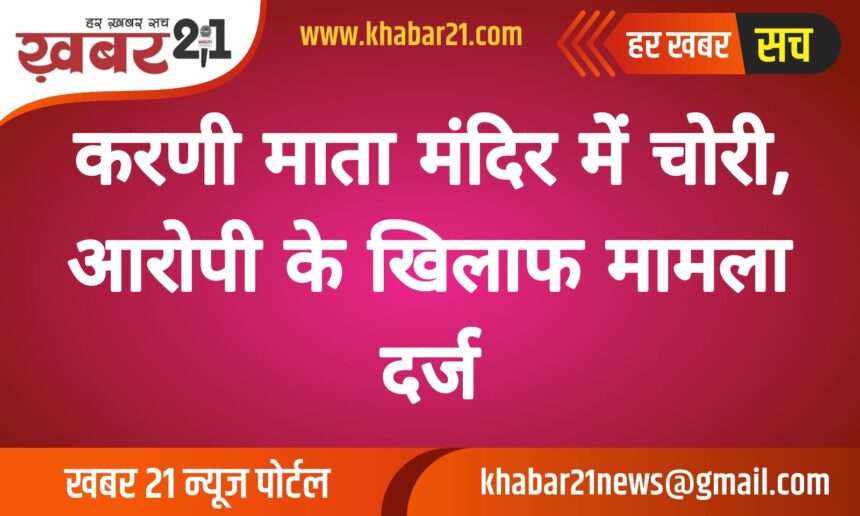 बीकानेर। देराजसर करणी माता मन्दिर में चांदी का छत्र व नगदी रुपए चोरी के आरोप में एक नामजद के खिलाफ शेरुणा थाने में मामला दर्ज हुआ है। देराजसर निवासी 73 वर्षीय रामचंद्र पुत्र मघाराम जाट ने कोटासर निवासी नोपाराम उर्फ छोटूलाल के खिलाफ आरोप लगाया है। परिवादी ने पुलिस को बताया कि आरोपी ने 10 जुलाई को सुबह 5 बजे करणी माता मंदिर से 12,690 रुपए नगदी व चांदी का छत्र चोरी कर लिए। पुलिस ने मामला दर्ज कर जांच एएसआई चेनदान को दी गई है।