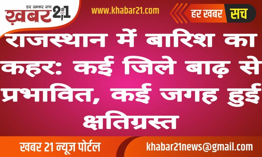 राजस्थान में सक्रिय हुए मानसून से हो रही भारी बारिश का कहर मंगलवार को भी जारी रहा। मंगलवार को राजसमंद, बाड़मेर जालोर, जैसलमेर, जोधपुर, पाली और अजमेर जिले में अति भारी वर्षा हुई। इन जिलों में बाढ़ के हालात रहे। सर्वाधिक बारिश जैसलमेर के मोहनगढ़ में 260 मिमी, पाली में 257 मिमी और अजमेर के नसीराबाद में 165 मिमी दर्ज की गई है। मौसम विभाग ने आज 7 जिलों में भारी बारिश का अलर्ट जारी किया है। लगातार बारिश के चलते जैसलमेर के 868 साल पुराने सोनार दुर्ग की बुर्ज से लगती दीवार का एक हिस्सा भरभरा कर गिर गया। पाली जिले में मुख्यालय के साथ ही सोजत और मारवाड़ जंक्शन में अब तक औसत से ज्यादा बारिश हो चुकी है। पाली और सोजत कस्बे में जनजीवन पूरी तरह प्रभावित रहा। पाली में 70 से ज्यादा कॉलोनियां जलमग्न है। फलोदी के लोहावट क्षेत्र में दो दिनों से हो रही बारिश के कारण कई गांव व कस्बे पानी से घिर गए हैं। थाना परिसर में करीब 3 फीट पानी भर गया है। ऐसे में पुलिसकर्मी ट्यूब की मदद से लोहावट थाने तक