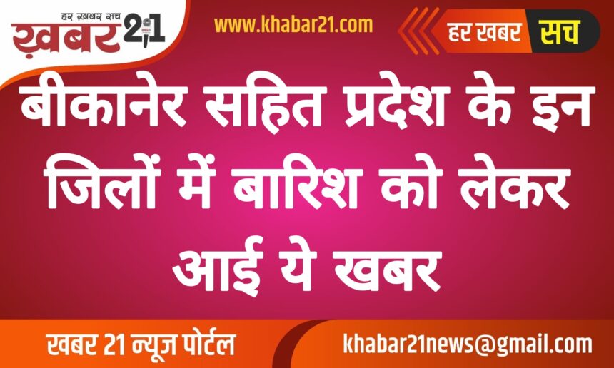 प्रदेश में मानसून पुरी तरह से सक्रिय है। जिसके चलते बारिश का दौर जारी है। मौसम विभाग ने आज शनिवार को प्रदेश के 17 जिलों में बारिश को लेकर अलर्ट जारी किया है। विभाग के अनुसार प्रदेश के ऊपर बने एक साइक्लोनिक सर्कुलेशन के कारण ऐसा होगा। इस सिस्टम के बीच से मानसून की ट्रफ लाइन गुजर रही है। इसके कारण आज पांच जिलों में बारिश का ऑरेंज अलर्ट जारी किया गया है। वहीं, 17 जिलों में येलो अलर्ट है। विभाग के अनुसार आज बारां,बूंदी,कोटा,सवाई माधोपुर,टोंक में ऑरेज अलर्ट जारी किया गया है। वहीं अजमेर,अलवर,भरतपुर,भीलवाड़ा,चित्तौडग़ढ़,दौसा,धोलपुर,जयपुर,झालावाड़,झुझुनूं,करौली,सीकर,बीकानेर,चुरू,हनुमानगढ़,नागौर,श्रीगंगानगर में येलो अलर्ट जारी किया है।
