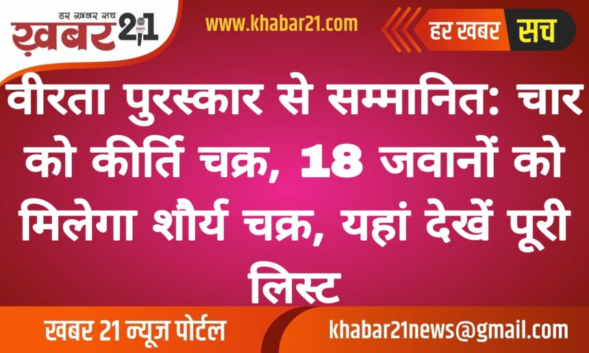 राष्ट्रपति द्रौपदी मुर्मु ने स्वतंत्रता दिवस की पूर्व संध्या पर सशस्त्र बलों और केंद्रीय सशस्त्र पुलिस बलों के 103 कर्मियों को वीरता पुरस्कारों से सम्मानित किए जाने की मंजूरी दी है जिनमें चार कीर्ति और 18 शौर्य चक्र शामिल हैं। रक्षा मंत्रालय ने बुधवार को बताया कि तीन रणबांकुरों को मरणोपरांत कीर्ति चक्र और चार को मरणोपरांत शौर्य चक्र से सम्मानित करने का निर्णय लिया गया है।