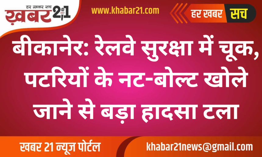 Khabar21 > Blog > बीकानेर > बीकानेर: रेलवे सुरक्षा में चूक, पटरियों के नट-बोल्ट खोले जाने से बड़ा हादसा टला