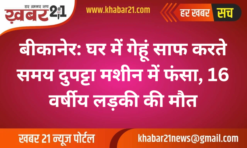 बीकानेर। 7 अक्टूबर को सुबह 7 बजे देशनोक थाना क्षेत्र में एक दर्दनाक घटना घटी, जिसमें 16 वर्षीय अमनचैन की मशीन में दुपट्टा फंसने से मौत हो गई। जानकारी के अनुसार, अमनचैन घर पर गेहूं साफ कर रही थी, तभी अचानक उसका दुपट्टा मशीन में चला गया, जिससे उसका गला दबने लगा।