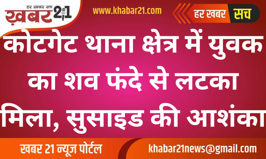 कोटगेट थाना क्षेत्र में स्थित एक पुराने खंडहरनुमा कमरे में एक युवक का शव फंदे से लटका हुआ मिला है। इस घटना की सूचना पर पुलिस और खिदमतगार खादिम सोसायटी के लोग मौके पर पहुंचे और शव को कब्जे में लेकर अस्पताल की मोर्चरी में रखवाया। प्रथम दृष्टया इसे आत्महत्या का मामला माना जा रहा है। मृतक की पहचान 26 वर्षीय भगवानाराम, पुत्र हरिकिशन के रूप में की गई है। उसका शव सूरज टॉकीज क्षेत्र में एक खंडहरनुमा कमरे में मिला।