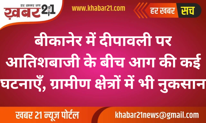 कोतवाली थाना क्षेत्र के जेल रोड पर एक पटाखों की दुकान में आग लगने से एकबारगी हड़कंप मच गया। बाबूलाल फाटक के पास रेलवे की जमीन पर झाड़ियों में, और सोनगिरी कुंए के पास भी आग लग गई। नोखा के चरकड़ा गांव की ढ़ाणी में आग लगने से किसान परिवार को काफी नुकसान हुआ, जहां घर में रखा सामान पूरी तरह स्वाहा हो गया।