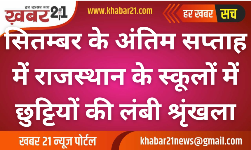 जयपुर। राजस्थान के सरकारी स्कूलों में सितम्बर माह के अंतिम सप्ताह में छात्रों और शिक्षकों को अवकाश का सुनहरा अवसर मिलने जा रहा है। शिक्षा विभाग द्वारा घोषित कार्यक्रम और त्योहारी कैलेंडर के अनुसार 26, 27, 28 और 30 सितम्बर को सभी सरकारी स्कूल बंद रहेंगे।