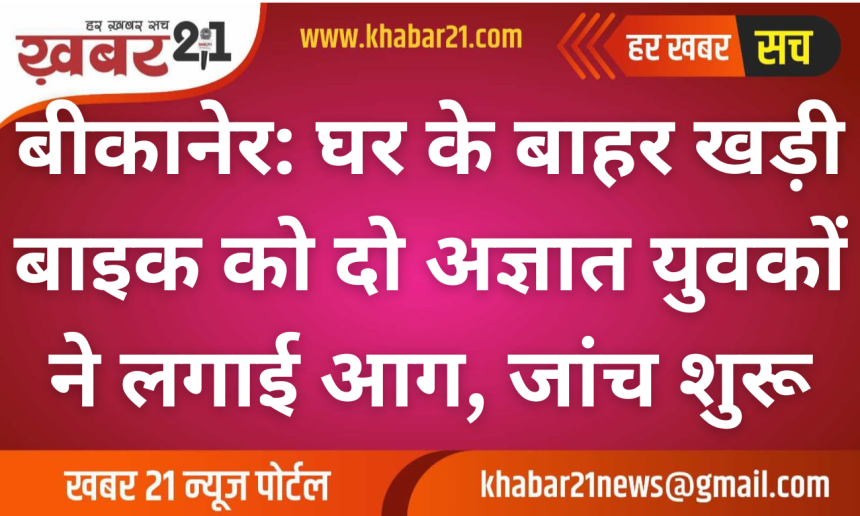 बीकानेर के जेएनवीसी थाना क्षेत्र में 25 सितंबर की रात एक चौंकाने वाली घटना सामने आई है, जहां दो अज्ञात व्यक्तियों ने घर के बाहर खड़ी बाइक को आग के हवाले कर दिया। यह घटना उदासर गांव की है, जिसने इलाके में दहशत का माहौल बना दिया है।