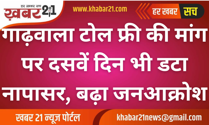 बीकानेर/नापासर – गाढ़वाला टोल प्लाजा को स्थायी रूप से टोल फ्री किए जाने की मांग को लेकर नापासर में जारी विरोध-प्रदर्शन दसवें दिन भी नहीं थमा। आंदोलन स्थल पर सोमवार को बड़ी संख्या में ग्रामीणों और जनप्रतिनिधियों की मौजूदगी रही, जिन्होंने सरकार की उपेक्षा भरी नीति को लेकर खुलकर नाराजगी जाहिर की।