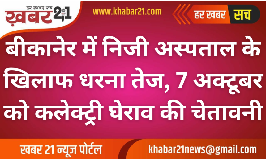 बीकानेर शहर में एक निजी अस्पताल के खिलाफ चल रहे धरने ने अब बड़ा रूप ले लिया है। कांग्रेस के युवा नेता रामनिवास कूकणा की अगुवाई में आयुष्मान हार्ट केयर सेंटर के बाहर बीते 23 दिनों से विरोध प्रदर्शन जारी है। प्रदर्शनकारियों ने अब एलान किया है कि वे 7 अक्टूबर को हजारों लोगों के साथ कलेक्ट्री का घेराव करेंगे।