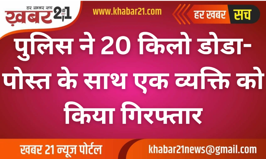 बीकानेर। बज्जू उपखंड क्षेत्र की रणजीतपुरा पुलिस ने शनिवार को नशा तस्करी के खिलाफ बड़ी कार्रवाई करते हुए 20 किलो 80 ग्राम डोडा-पोस्त जब्त किया है। पुलिस ने मौके से एक आरोपी को गिरफ्तार किया, जो डोडा-पोस्त की सप्लाई की फिराक में था।