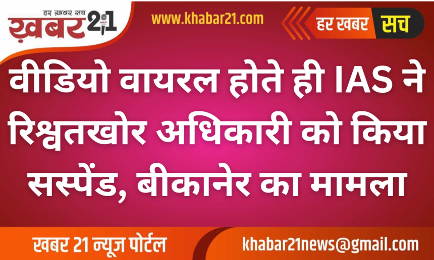 राजस्थान के बीकानेर जिले में भ्रष्टाचार के एक मामले में त्वरित प्रशासनिक कार्रवाई देखने को मिली है। प्रधानमंत्री आवास योजना के तहत रिश्वत मांगने का एक वीडियो सामने आने के बाद संबंधित अधिकारी को तत्काल प्रभाव से निलंबित कर दिया गया है। वीडियो सामने आने के कुछ ही घंटों के भीतर ही यह सख्त कदम उठाया गया, जिससे जिला प्रशासन की तत्परता की सराहना हो रही है।