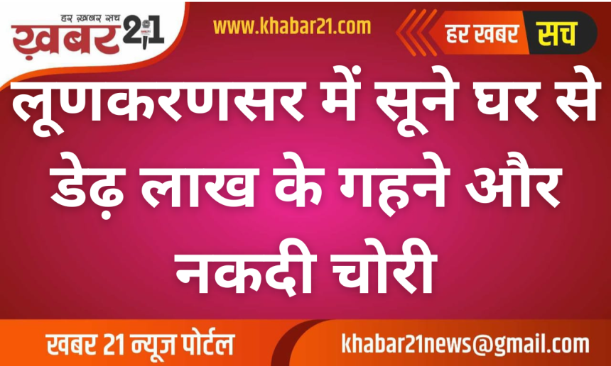बीकानेर। लूणकरणसर थाना क्षेत्र में एक सूने मकान से चोरों ने डेढ़ लाख रुपए से अधिक मूल्य के गहने और नकदी चोरी कर ली। परिवार दीपावली मनाने अपने गांव गया था, लौटने पर घर के दरवाजे का ताला टूटा और सामान बिखरा हुआ मिला।