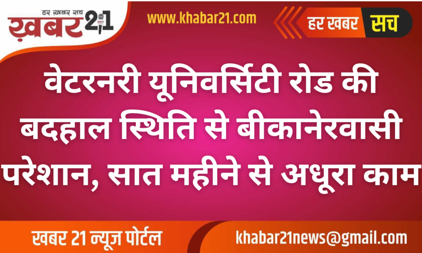 बीकानेर। शहर की प्रमुख सड़कों में शामिल दीनदयाल उपाध्याय सर्किल से वेटरनरी यूनिवर्सिटी, गांधी नगर, करणी नगर और कैलाशपुरी तक जाने वाला मार्ग इन दिनों बदहाली की चरम सीमा पर है। यह सड़क पिछले सात महीनों से खस्ताहाल बनी हुई है। धूल, मिट्टी और गड्ढों से होकर गुजरना यहां के लोगों की मजबूरी बन चुका है।
