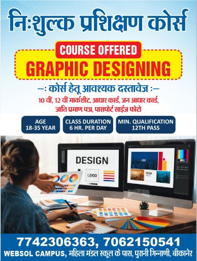 राजस्थान कौशल एवं आजीविका विकास निगम द्वारा 18 वर्ष से 35 वर्ष के बेरोजगार युवाओं के लिए रोजगार आधारित कौशल विकास कार्यक्रम चलाए जा रहे हैं। योजना के तहत विभिन्न कोर्सेज में निशुल्क आवेदन कर सकते हैं। ग्राफिक डिजाइनर एवं मेकअप आर्टिस्ट का कोर्स पुरानी गिन्नाणी मे संचालित होगा। कोर्स के साथ ही सॉफ्ट स्किल्स और स्वरोजगार की जानकारी भी दी जाएगी अधिक जानकारी के लिए 7742306363 में संपर्क किया जा सकेगा।