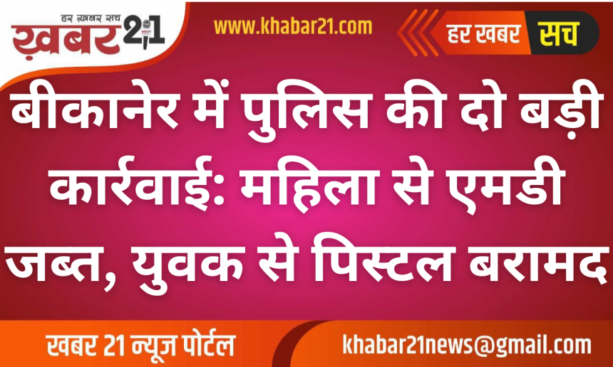 बीकानेर पुलिस ने अवैध गतिविधियों पर नकेल कसते हुए एक ही दिन में दो बड़ी कार्रवाइयाँ की हैं। पहली कार्रवाई में सदर थाना पुलिस ने एक महिला को मादक पदार्थ एमडी के साथ गिरफ्तार किया, जबकि दूसरी कार्रवाई में गंगाशहर थाना पुलिस ने एक युवक को अवैध पिस्टल के साथ पकड़ा। दोनों मामलों में पुलिस ने एनडीपीएस एक्ट और आर्म्स एक्ट के तहत मुकदमे दर्ज कर जांच शुरू कर दी है।