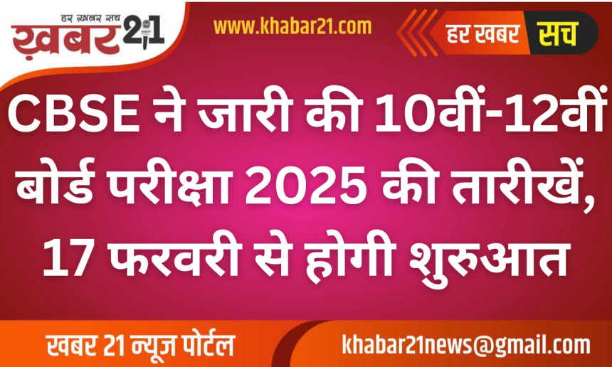 नई दिल्ली: केंद्रीय माध्यमिक शिक्षा बोर्ड (CBSE) ने वर्ष 2025 की कक्षा 10वीं और 12वीं बोर्ड परीक्षाओं की तारीखों की आधिकारिक घोषणा कर दी है। इस बार दोनों कक्षाओं की परीक्षाएं एक ही दिन यानी 17 फरवरी 2025 से प्रारंभ होंगी।