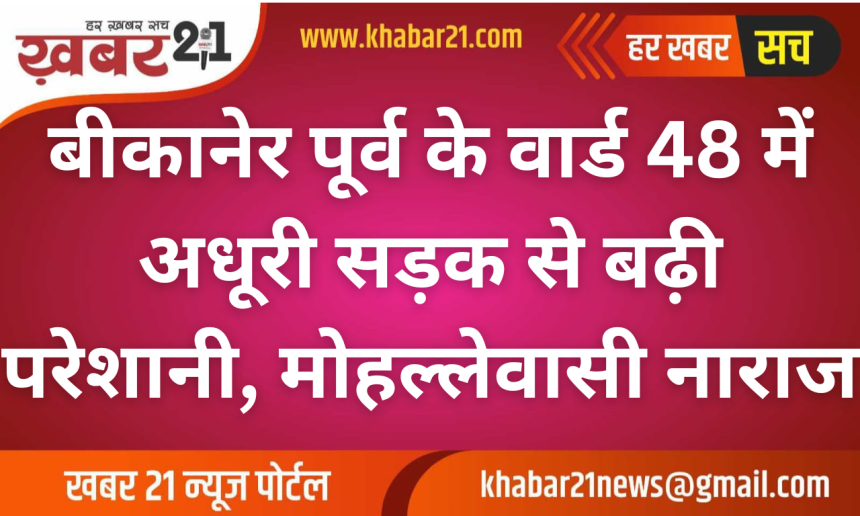 बीकानेर। बीकानेर पूर्व विधानसभा क्षेत्र के वार्ड नंबर 48 में अधूरी पड़ी सड़क स्थानीय निवासियों के लिए परेशानी का सबब बन गई है। रानी बाजार के बांद्रा बास से लक्की मॉडल स्कूल तक बनाई जा रही सड़क का निर्माण कार्य पिछले पंद्रह दिनों से ठप पड़ा है। इस कारण पूरे इलाके में गड्ढे, धूल और मलबा फैल गया है, जिससे आवागमन बेहद मुश्किल हो गया है।