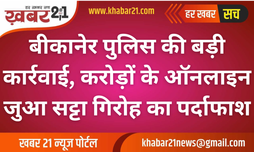 बीकानेर पुलिस ने जिले में चल रहे ऑनलाइन जुआ-सट्टा नेटवर्क के खिलाफ बड़ी कार्रवाई करते हुए करोड़ों रुपये के अवैध कारोबार का भंडाफोड़ किया है। यह कार्रवाई आईजी हेमंत शर्मा और एसपी कावेन्द्र सागर के नेतृत्व में सीओ सदर अनुष्ठा कालिया की निगरानी में की गई। पुलिस ने इस मामले में दो मुख्य आरोपियों—प्रमोद खत्री और वली मोहम्मद उर्फ विशाल—को गिरफ्तार किया है।