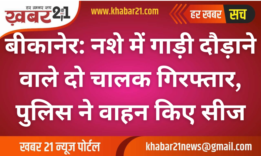 बीकानेर। जिले में सड़क सुरक्षा अभियान के तहत पुलिस ने मंगलवार को बड़ी कार्रवाई करते हुए नशे की हालत में वाहन चला रहे दो चालकों को गिरफ्तार किया है।