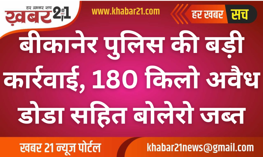बीकानेर पुलिस की कार्रवाई: 180 किलो अवैध डोडा बरामद, बोलेरो लावारिस हालत में मिली