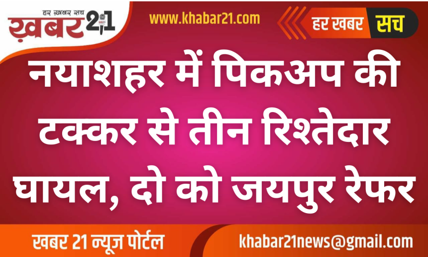 नयाशहर थाना क्षेत्र में एक सड़क हादसे का मामला सामने आया है, जिसमें पिकअप वाहन ने बाइक सवार तीन रिश्तेदारों को जोरदार टक्कर मार दी। हादसे की रिपोर्ट सीताराम गेट के पास रहने वाले नरोतम स्वामी ने दर्ज करवाई है।