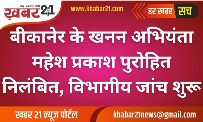 राजस्थान सरकार के खनन एवं पेट्रोलियम विभाग ने प्रशासनिक सख्ती दिखाते हुए बीकानेर में पदस्थ खनन अभियंता महेश प्रकाश पुरोहित को तत्काल प्रभाव से निलंबित कर दिया है। विभाग की ओर से जारी आदेशों में कहा गया है कि उनके खिलाफ राजस्थान सिविल सेवा (वर्गीकरण, नियंत्रण एवं अपील) नियम 1958 के तहत अनुशासनात्मक कार्रवाई प्रस्तावित है, इसलिए उन्हें निलंबित किया जा रहा है।