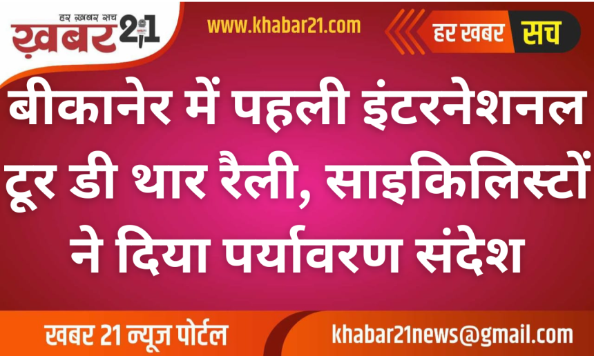राजस्थान के बीकानेर जिले में पहली बार इंटरनेशनल स्तर की “टूर डी थार” साइकिल रैली का आयोजन किया गया, जिसने देश–विदेश के साइकिल प्रेमियों को थार के रेतीले विस्तार में एकजुट कर दिया। केंद्रीय मंत्री अर्जुन राम मेघवाल की पहल पर आयोजित यह रैली नौरंगदेसर से शुरू हुई और इसमें फ्रांस, जर्मनी, स्विट्जरलैंड, सिंगापुर सहित कई देशों से आए खिलाड़ियों के साथ भारत के 20 राज्यों के साइकिलिस्टों ने हिस्सा लिया। कुल प्रतिभागियों की संख्या 750 से अधिक रही।