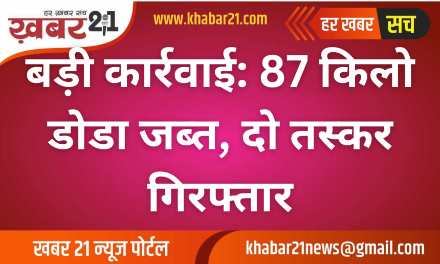 पुलिस को अवैध मादक पदार्थों की तस्करी की सूचना मिली थी, जिसके आधार पर विशेष टीम का गठन किया गया। कार्रवाई के दौरान टीम ने संदिग्ध वाहन को रोककर उसकी तलाशी ली। जांच में स्विफ्ट कार से लगभग 87 किलो 700 ग्राम अवैध डोडा बरामद किया गया। कार में मौजूद दो व्यक्तियों को मौके पर ही हिरासत में ले लिया गया।