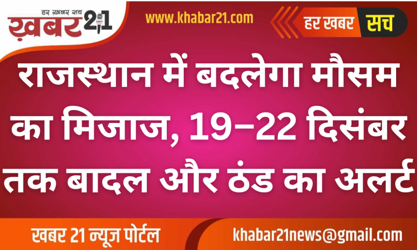 Khabar21 > Blog > राजस्थान > राजस्थान में बदलेगा मौसम का मिजाज, 19–22 दिसंबर तक बादल और ठंड का अलर्ट