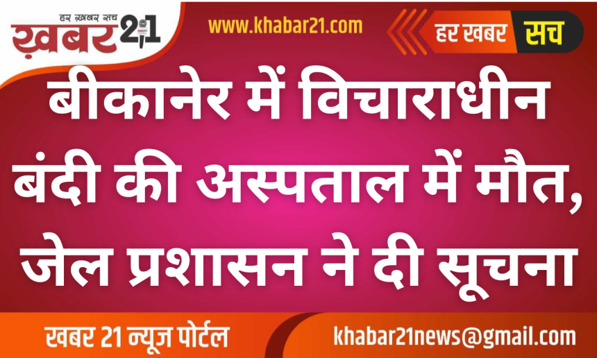 बीकानेर। केन्द्रीय कारागृह श्रीगंगानगर में बंद एक विचाराधीन बंदी की अस्पताल में मौत हो गई। इस घटना की जानकारी सदर पुलिस थाने में कारागृह केन्द्रीय कारागृह सुरजनारायण सोनी ने दी। रिपोर्ट के अनुसार मृतक का नाम चुन्नीलाल पुत्र रातीराम बताया गया है, जो एनडीपीएस एक्ट के तहत गंगानगर जेल में बंद था।