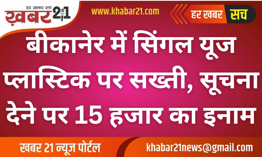 बीकानेर। जिले में प्रतिबंधित सिंगल यूज प्लास्टिक और प्लास्टिक कैरी बैग के खिलाफ कार्रवाई को मजबूत करने के लिए राजस्थान राज्य प्रदूषण नियंत्रण मंडल ने आमजन की सहभागिता के साथ नई पहल शुरू की है। प्रतिबंधित सिंगल यूज प्लास्टिक का विनिर्माण करने वाली किसी भी इकाई की पुख्ता सूचना देने पर 15,000 रुपये की प्रोत्साहन राशि दी जाएगी।