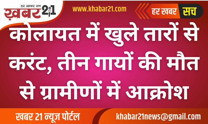 बीकानेर। कोलायत क्षेत्र के झझु गांव में खुले पड़े विद्युत प्रवाहित तारों की चपेट में आने से तीन गायों की मौत हो गई। यह हादसा बीएसएनएल टावर के नीचे हुआ, जहां लंबे समय से खुले तार पड़े होने की बात ग्रामीणों द्वारा बताई जा रही है। घटना के बाद गांव में तनाव और आक्रोश का माहौल बन गया, बड़ी संख्या में लोग मौके पर जमा हो गए।
