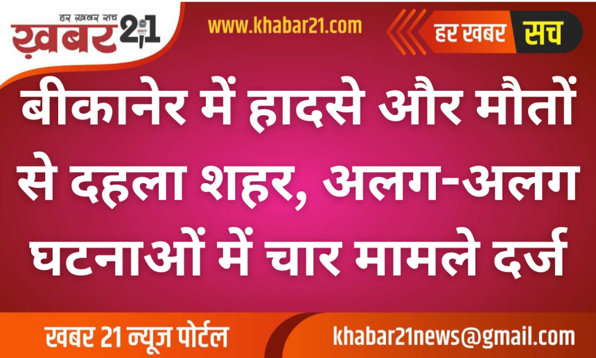 बीकानेर जिले में बीते कुछ दिनों के दौरान सड़क हादसों और संदिग्ध परिस्थितियों में हुई मौतों के कई मामले सामने आए हैं। अलग-अलग थाना क्षेत्रों में हुई इन घटनाओं ने सुरक्षा और सावधानी को लेकर एक बार फिर सवाल खड़े कर दिए हैं। पुलिस ने सभी मामलों में मर्ग दर्ज कर जांच शुरू कर दी है।