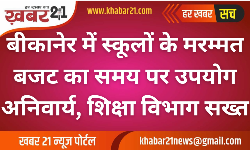 बीकानेर। राजकीय विद्यालयों के भवनों की बुनियादी सुविधाओं को बेहतर बनाने के लिए आवंटित मरम्मत बजट का समय पर उपयोग अनिवार्य कर दिया गया है। माध्यमिक शिक्षा निदेशालय ने सभी विद्यालयों के प्रधानाचार्यों को स्पष्ट निर्देश दिए हैं कि वित्तीय वर्ष 2025-26 में स्वीकृत राशि का उपयोग न करने पर नियमानुसार सख्त कार्रवाई की जाएगी।
