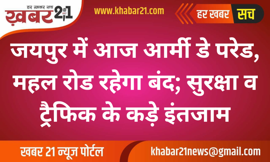 राजधानी जयपुर में आज 15 जनवरी को आर्मी डे परेड का आयोजन किया जा रहा है, जिसे लेकर शहर में सुरक्षा और यातायात के व्यापक प्रबंध किए गए हैं। यह परेड जगतपुरा क्षेत्र के महल रोड पर आयोजित होगी, जहां बड़ी संख्या में लोगों के पहुंचने की संभावना है। अनुमान है कि करीब डेढ़ लाख दर्शक इस कार्यक्रम को देखने आएंगे।