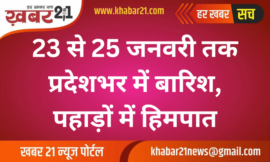 23 से 25 जनवरी के बीच प्रदेश के सभी जिलों में बारिश की संभावना जताई गई है। खास बात यह है कि इस दौरान 2500 मीटर ऊंचाई तक भी बर्फबारी हो सकती है, जो इस सीजन में पहली बार अनुमानित है। मौसम विभाग का कहना है कि इस बदलाव से पहाड़ी क्षेत्रों में ठंड और बढ़ेगी, वहीं लंबे समय से बारिश-बर्फबारी का इंतजार कर रहे लोगों को राहत मिल सकती है।