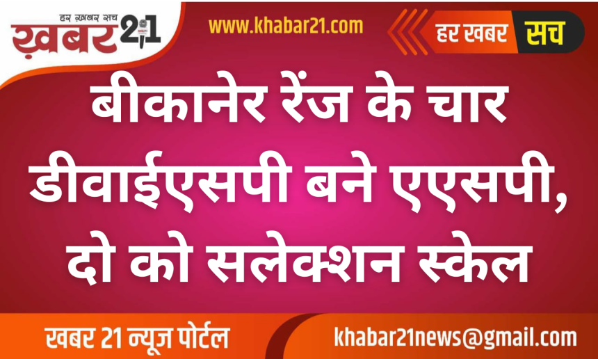 बीकानेर। राजस्थान पुलिस सेवा में पदोन्नतियों को लेकर बड़ा प्रशासनिक फैसला सामने आया है। बीकानेर रेंज में कार्यरत चार डीवाईएसपी को पदोन्नत कर अतिरिक्त पुलिस अधीक्षक (ASP) बनाया गया है, जबकि दो वरिष्ठ अधिकारियों को सलेक्शन स्केल प्रदान किया गया है।