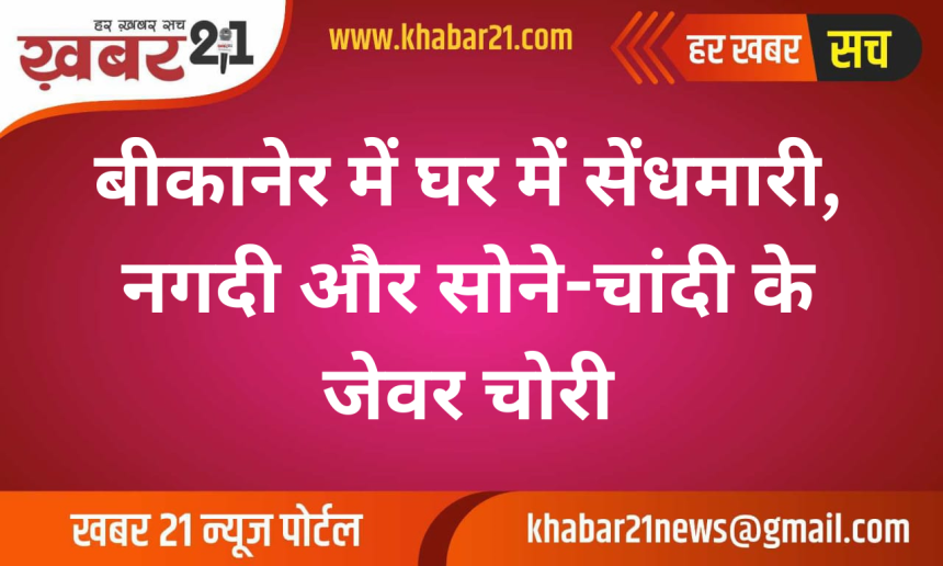 बीकानेर में अज्ञात चोरों ने एक मकान को निशाना बनाते हुए नगदी और कीमती आभूषण चोरी कर लिए। इस संबंध में सदर पुलिस थाने में मामला दर्ज कराया गया है।
