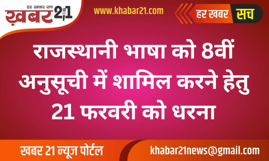 बीकानेर में राजस्थानी भाषा को संविधान की 8वीं अनुसूची में शामिल करने और राजभाषा का दर्जा दिलाने की मांग को लेकर 21 फरवरी 2026, विश्व मातृ भाषा दिवस पर एक दिवसीय धरना आयोजित किया जाएगा। इस संबंध में राजस्थानी मोट्यार परिषद द्वारा प्रेस कॉन्फ्रेंस कर कार्यक्रम की जानकारी दी गई।