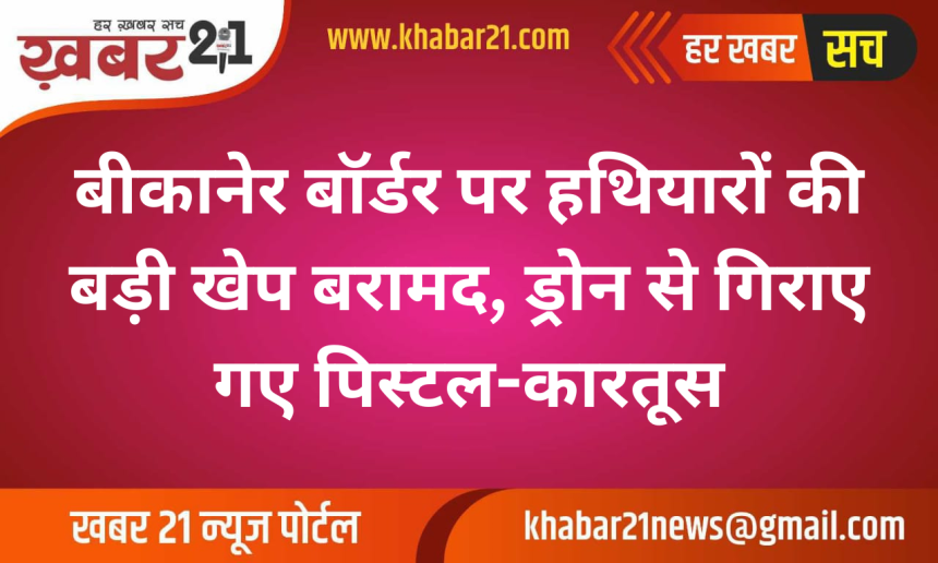 बीकानेर। राजस्थान के बीकानेर जिले से लगती अंतरराष्ट्रीय सीमा पर हथियारों की बड़ी तस्करी का मामला सामने आया है। घटना खाजूवाला क्षेत्र की है, जहां सीमा पार से ड्रोन के जरिए हथियार भारतीय सीमा में गिराए जाने की सूचना मिली।