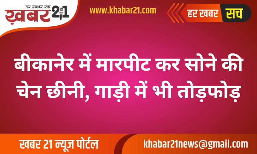 बीकानेर के बीछवाल पुलिस थाने में चार मार्च को मारपीट और चोरी का मामला दर्ज हुआ। करणी नगर स्थित बालाजी डिपार्टमेंट स्टोर में देवेंद्र सिंह के अनुसार, आरोपियों ने शराब के पैसे मांगे। पैसे न देने पर उन्होंने उससे मारपीट की और सोने की चेन छीनी।