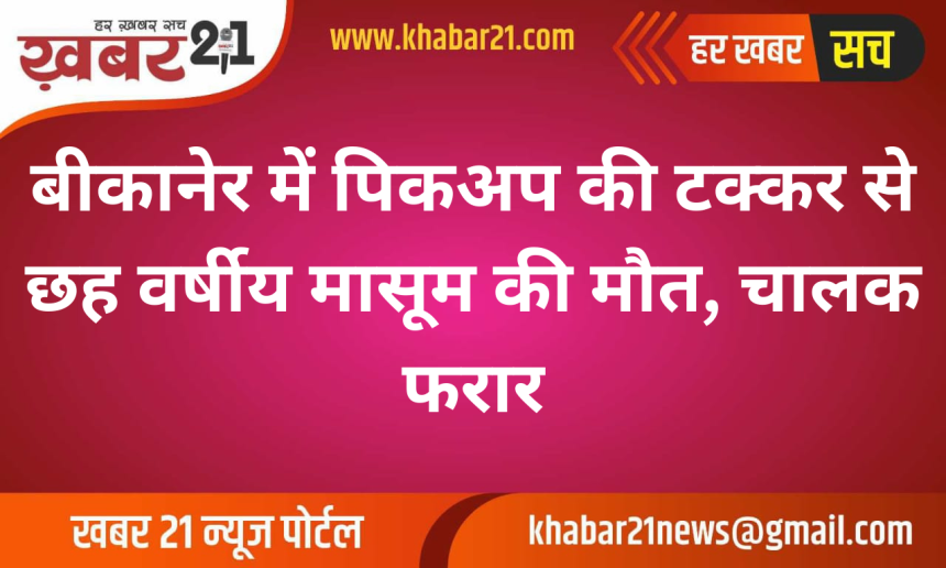 बीकानेर के खाजूवाला थाना क्षेत्र में सड़क हादसे में छह वर्षीय बच्चे की मौत हो गई। पिकअप चालक की लापरवाही से हुए इस हादसे के बाद आरोपी वाहन सहित मौके से फरार हो गया।