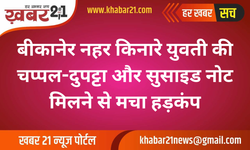 बीकानेर। जिले के छतरगढ़ थाना क्षेत्र में इंदिरा गांधी नहर परियोजना की नहर के पास एक युवती के डूबने की आशंका से शुक्रवार को हड़कंप मच गया। सतासर के पास आरडी 605 के निकट नहर किनारे युवती की चप्पल और दुपट्टा मिलने के बाद पुलिस ने सर्च ऑपरेशन शुरू कर दिया।