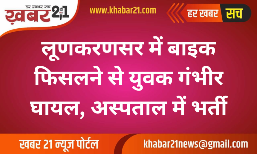 बीकानेर जिले के लूणकरणसर कस्बे के पास कच्चे रास्ते पर बाइक फिसलने से एक युवक गंभीर रूप से घायल हो गया। सूचना मिलने पर एम्बुलेंस टीम मौके पर पहुंची और घायल को तुरंत अस्पताल पहुंचाया गया।