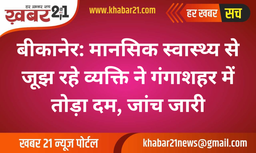 बीकानेर। जिले के गंगाशहर थाना क्षेत्र से एक हृदयविदारक घटना सामने आई है, जहाँ मानसिक तनाव से जूझ रहे एक व्यक्ति ने कथित तौर पर अपनी जीवन लीला समाप्त कर ली। घटना बुधवार, 11 मार्च की दोपहर वाल्मीकि बस्ती की बताई जा रही है।
