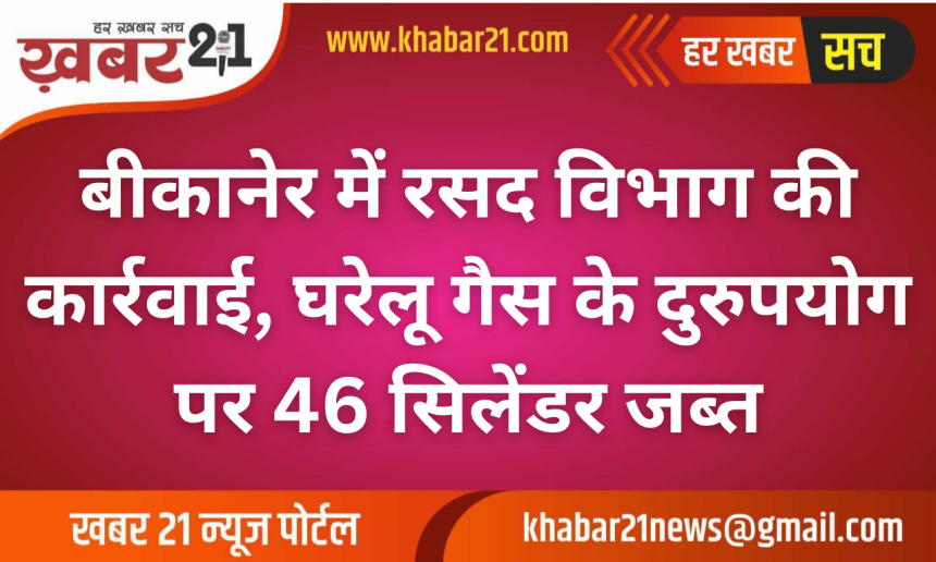Khabar21 > Blog > बीकानेर > बीकानेर में रसद विभाग की कार्रवाई, घरेलू गैस के दुरुपयोग पर 46 सिलेंडर जब्त