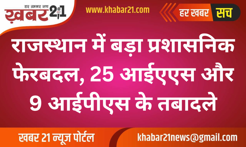 बीकानेर। राजस्थान सरकार ने प्रशासनिक व्यवस्था में बदलाव करते हुए बड़ा फेरबदल किया है। गुरुवार को जारी आदेश के तहत 25 आईएएस और 9 आईपीएस अधिकारियों के तबादले किए गए हैं। इससे पहले भी हाल ही में पुलिस विभाग में कई तबादले किए गए थे, जिसके बाद अब यह नई सूची जारी की गई है।